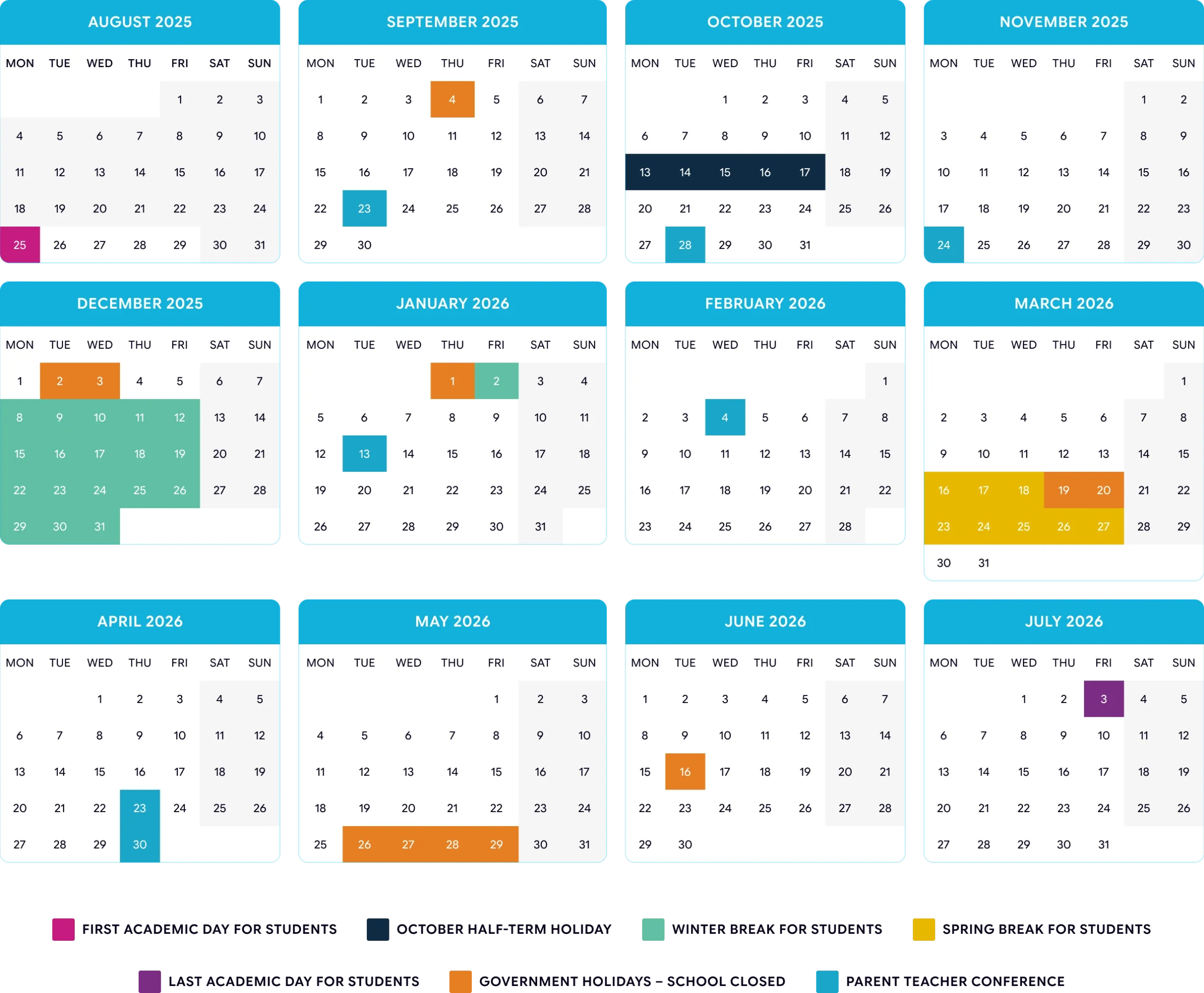 Islamic observances’ dates are subject to moon sighting; proposed holidays and school closures are subject to UAE Government announcement. Total school days (SD), as approved by KHDA, are 182 days.